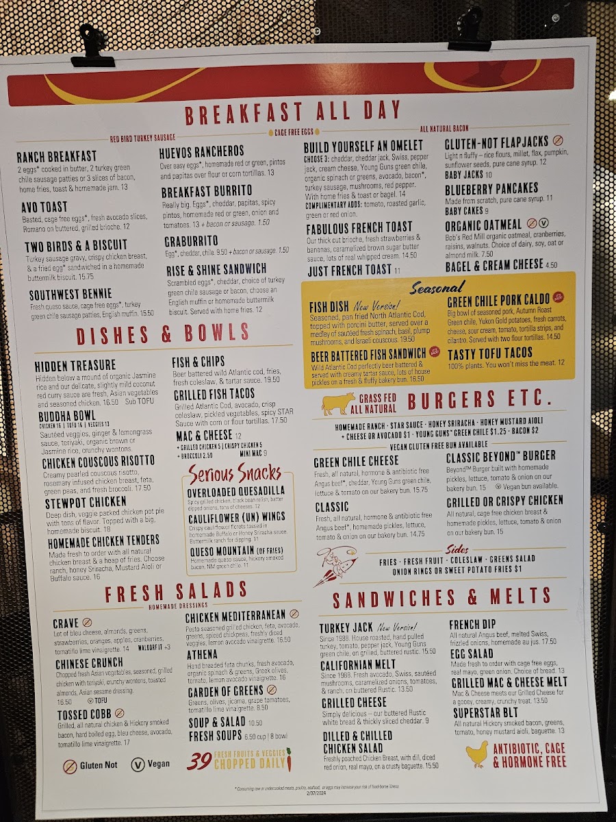 Choose 3: cheddar, cheddar jack, Swiss, pepper jack, cream cheese, Young Guns green chile, organic spinach or greens, avocado, bacon, turkey sausage, smoked ham, mushrooms, red pepper. Complimentary adds: tomato, roasted garlic, green or red onion. With home fries & toast or bagel.